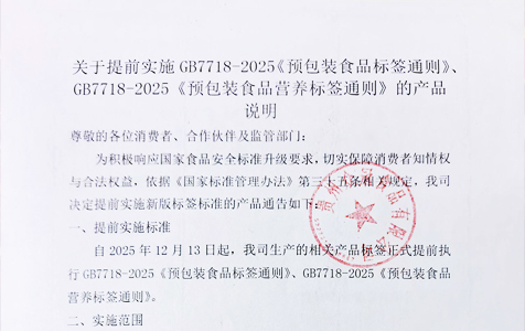 • 关于提前实施 GB7718-2025《预包装食品标签通则》、GB7718-2025《预包装食品营养标签通则》的产品说明
